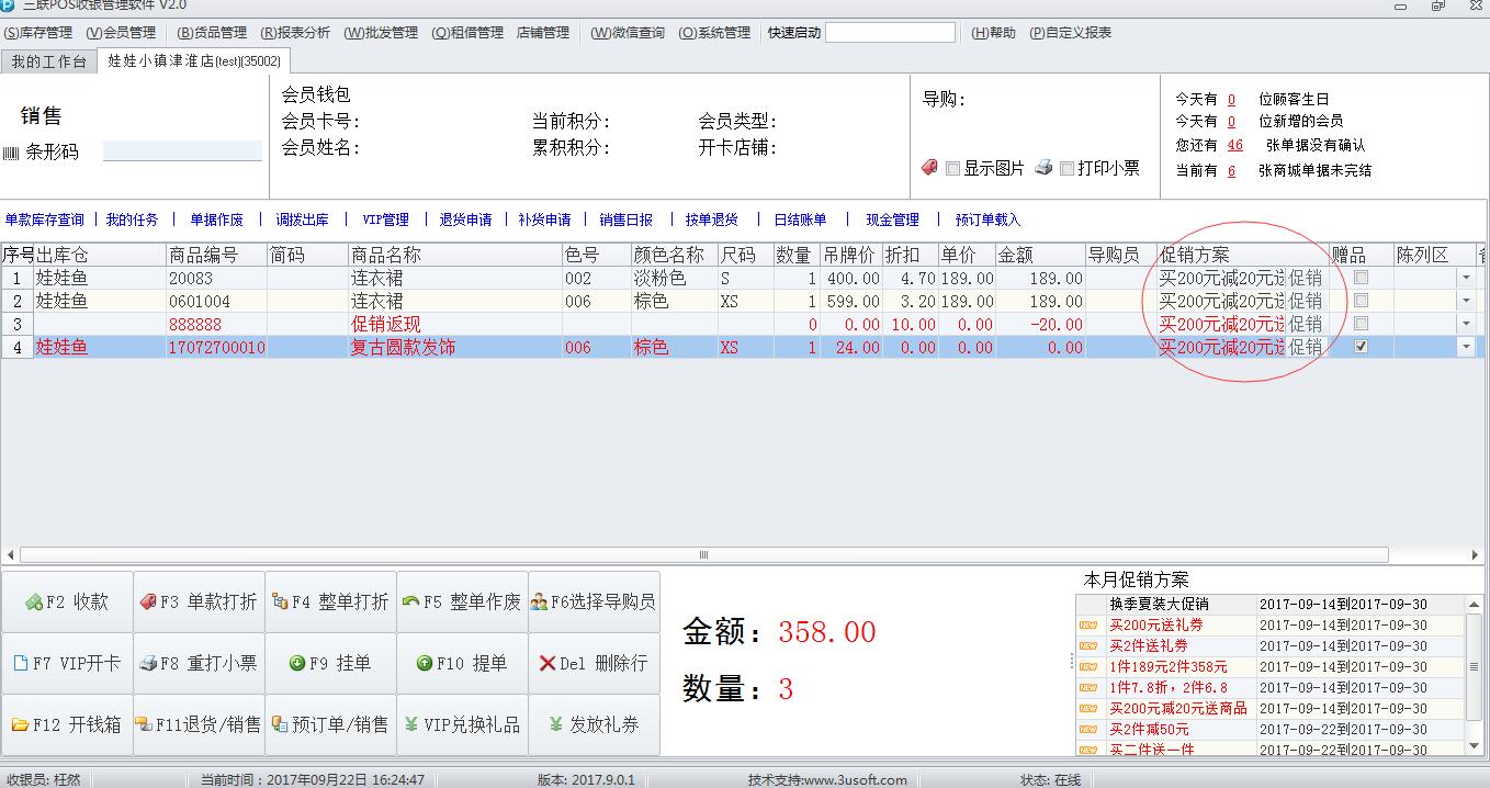 3.当该商品有使用单色特价促销方案或同时参与其他促销方案时,POS输入后会自动带出单色促销特价后的价格;