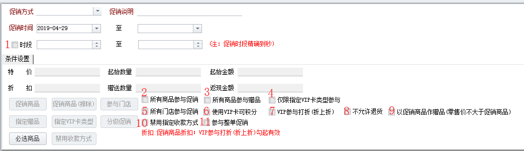 注:1.勾起“VIP参与打折(折上折)”,既可以享受促销折扣,还可以享有VIP卡原有的折扣;