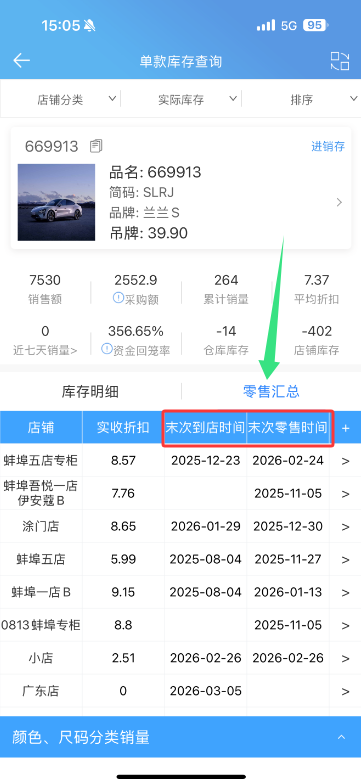 单款库存查询表按零售汇总查看页面表格模式添加“末次到店时间”和“末次零售时间”字段,显示的是该商品分别在各个店铺的最后一次到店日期以及最后一次零售日期