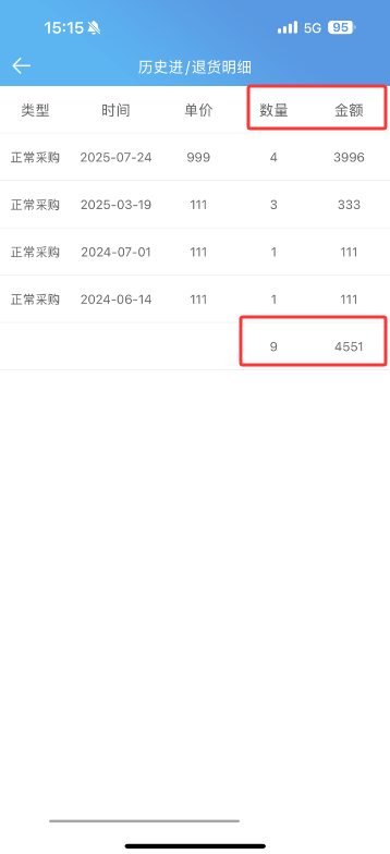 商品详情历史进退货明细页面最后一行添加显示“数量”和“金额”字段的汇总合计数据