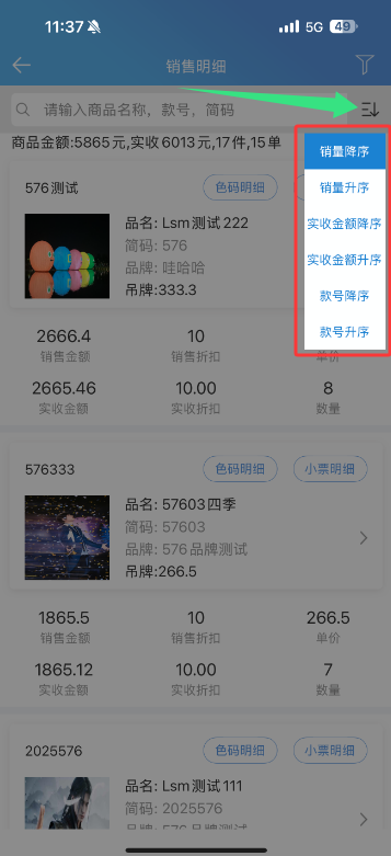 店铺业绩表销售明细页面搜索框右边添加排序功能,可以通过选择按销售商品“销量升/降序”“实收金额升/降序”以及“款号升/降序”这三种方式去排列显示商品顺序