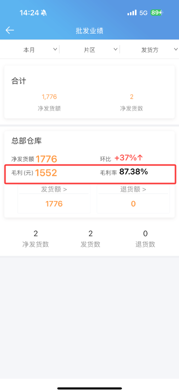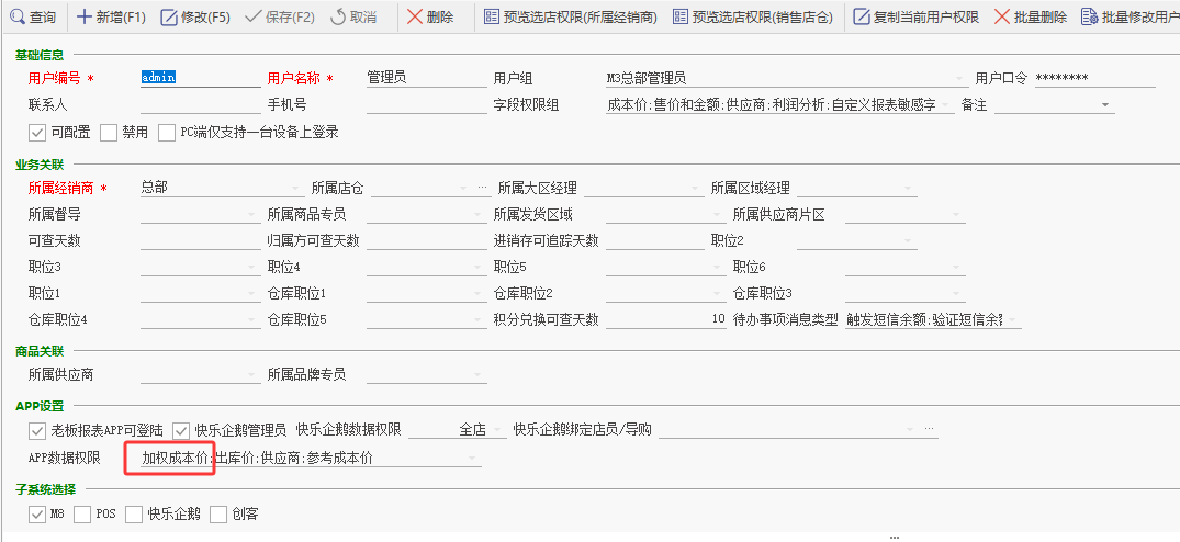 批发业绩表添加“毛利(元)”和“毛利率”字段,受分销系统用户与权限管理表APP数据权限“加权成本价”控制,当权限开启时则正常显示出这两个字段,反之权限关闭时隐藏