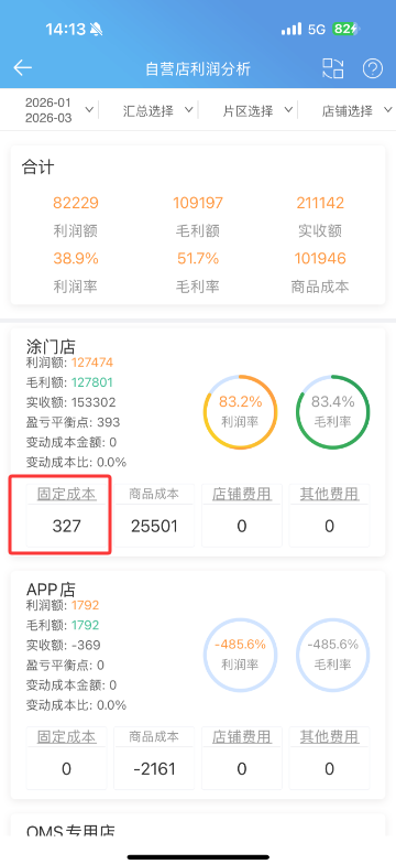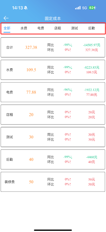 自营店利润分析表列表模式下“固定成本”详情页面改版,可以按全部查看查询时间范围内该店铺所有固定成本各个项目的明细金额汇总,也可以单独查看某一成本类型单独的支出金额以及同比环比金额/百分比数据