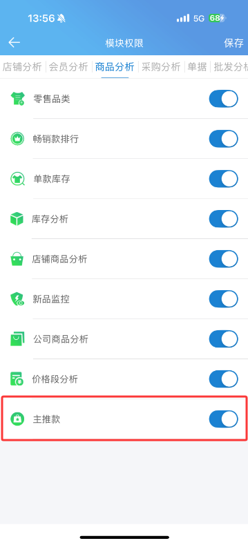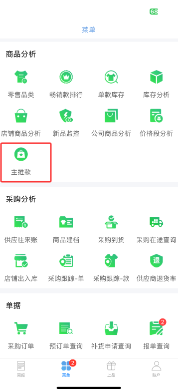 1、菜单页商品分析类增加“主推款”模块,与原来店铺业绩表详情页的主推款功能一致,现在直接添加显示到菜单页便于点击查看主推款方案相关设置内容