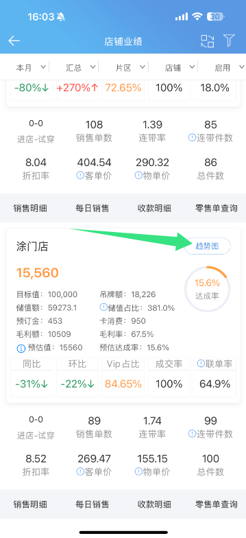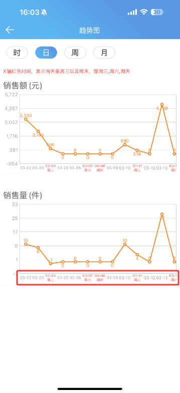 店铺业绩表趋势图按日查看时,横坐标日期后面添加括号显示周三,这样更便于区分哪个日期是星期几