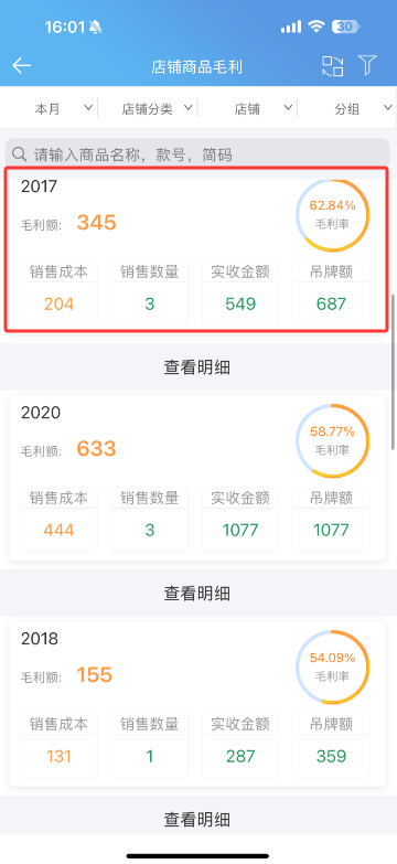 店铺商品毛利表顶部筛选分组条件添加支持按商品的“性别”“年份”以及“季节”三种类别进行分组显示出查询时间内店铺商品的毛利额、销售成本、销售数量、实收金额、吊牌额等数据信息