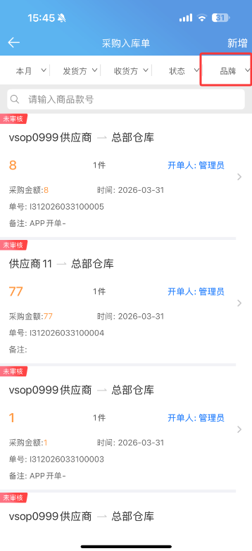 采购入库表顶部筛选添加按“品牌”筛选条件,可以通过单选或者多选商品的品牌去过滤出包含符合条件商品的采购入库单