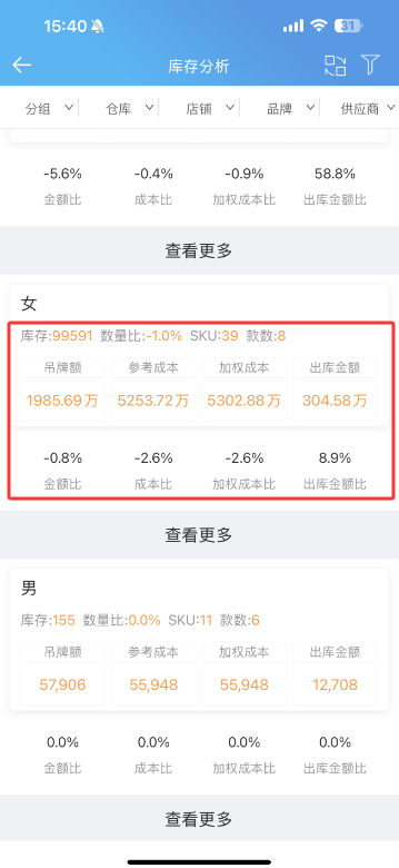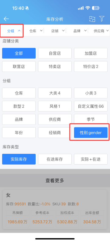 库存分析表顶部筛选分组类型添加支持按“性别”分组查询,通过该分组可以查看各个类别下商品的店铺/仓库库存数量、库存金额、库存sku数以及成本额等库存相关数据信息