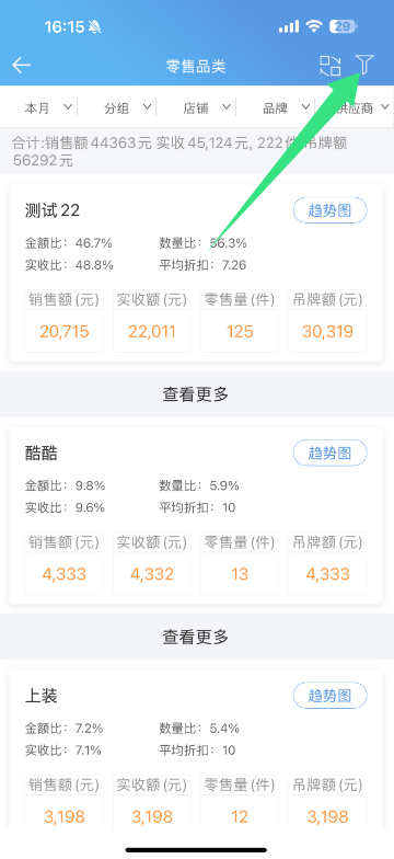 店铺业绩/导购维度/零售品类这三个模块高级筛选添加“零售类型”过滤条件,以零售品类表为例,可以通过单选或者多选零售类型去过滤出符合查询条件范围内的店铺商品销售额、实收额、零售件数以及吊牌额等零售相关数据信息