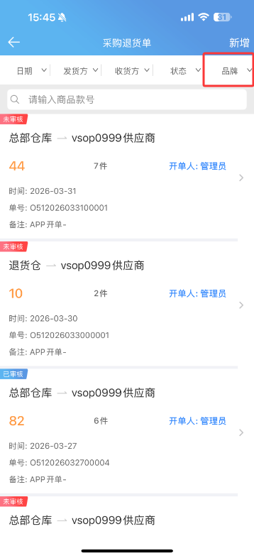 采购退货表顶部筛选添加按“品牌选择”筛选条件,可以通过单选或者多选商品的品牌去过滤出包含符合条件商品的采购退货单