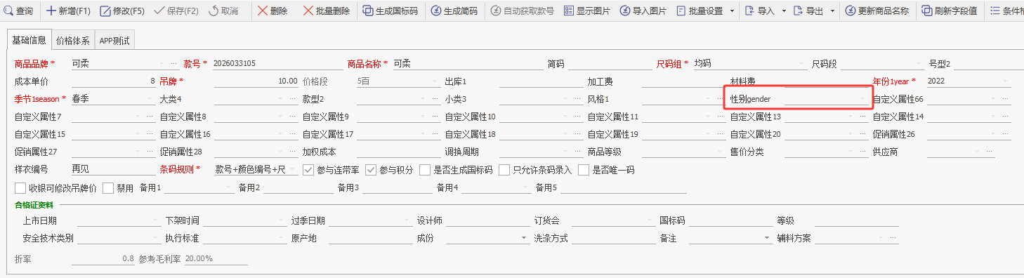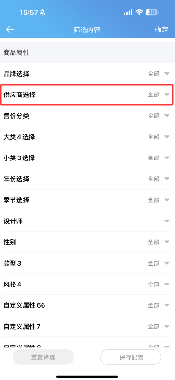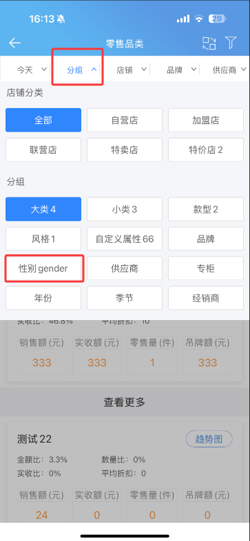 零售品类/店铺商品毛利/库存分析这三个模块列表顶部筛选分组条件按“性别”查询分组名称添加支持自动同步后台分销系统设置的自定义属性名称去显示,以零售品类表为例: