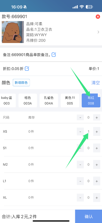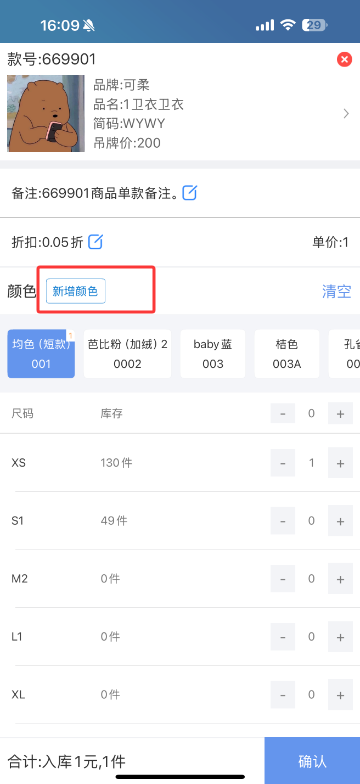 采购入库单模块开单添加商品颜色尺码数量页面增加支持“新增颜色”功能,点击新增颜色快捷入口跳转新增颜色页面,可以手动新建颜色资料也可以选择现有的颜色直接添加进商品中,然后编辑数量后进行开单操作