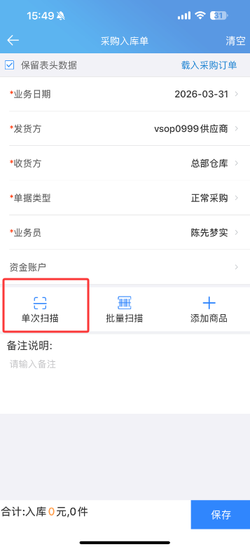 老板报表所有可单次扫描的做单模块添加支持选择相册图片扫码功能,以采购入库单为例,点击单次扫描选择条码图片上传后自动将这件商品录入单据内